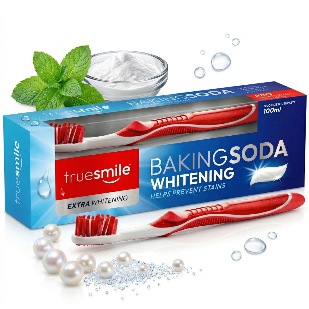 TrueSmile Baking Soda Whitening 100ml to zaawansowana pasta do zębów z sodą + szczoteczka, która skutecznie usuwa przebarwienia i przywraca naturalną biel uśmiechu. Dzięki właściwościom wodorowęglanu sodu produkt neutralizuje szkodliwe kwasy, eliminuje osad nazębny oraz zapobiega powstawaniu kamienia. Jest to kompletny zestaw do codziennej higieny, zapewniający profesjonalne efekty wybielania i długotrwałą świeżość w warunkach domowych.